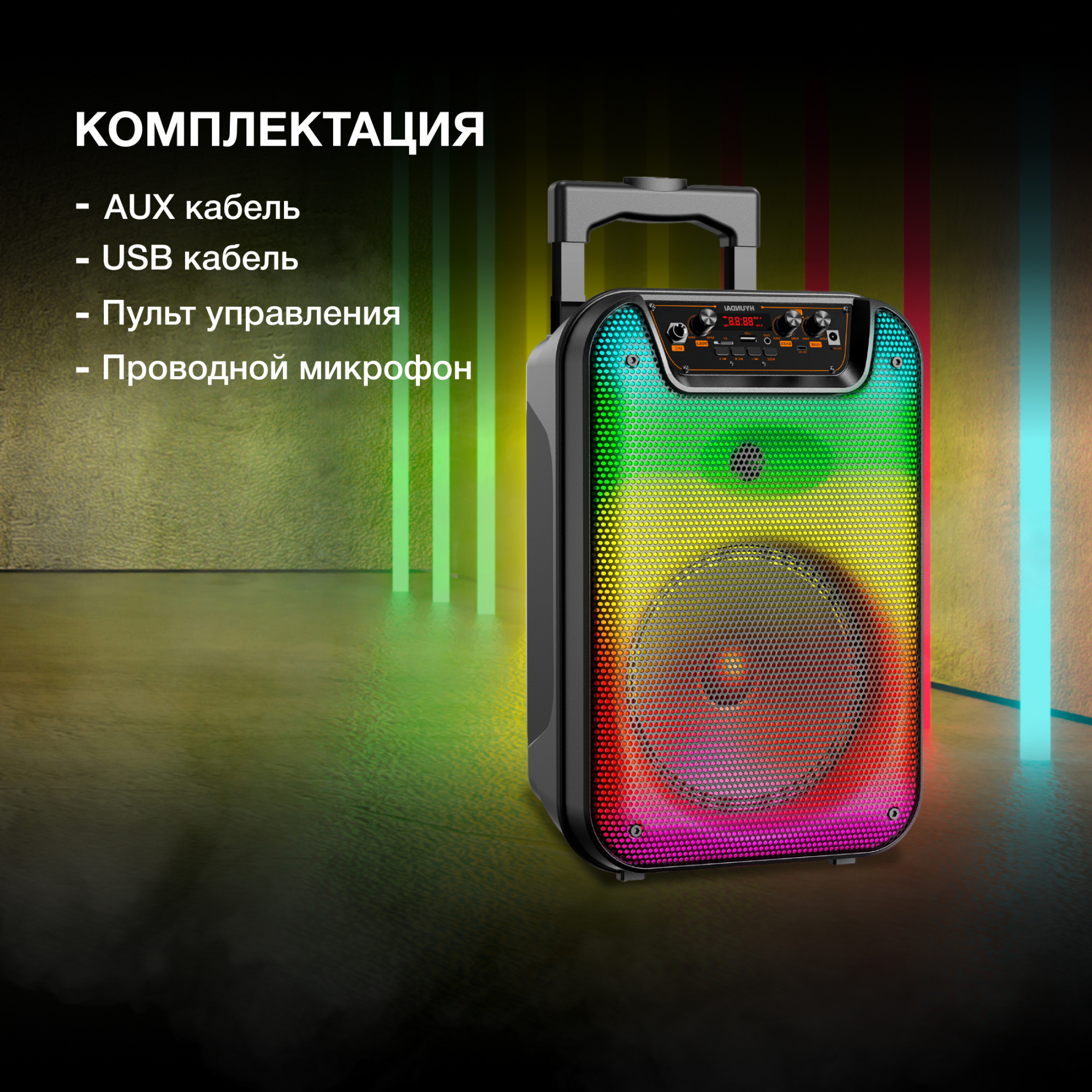 | Дополнительно в комплекте | USB кабель, AUX кабель, проводной микрофон, пульт, адаптер | |