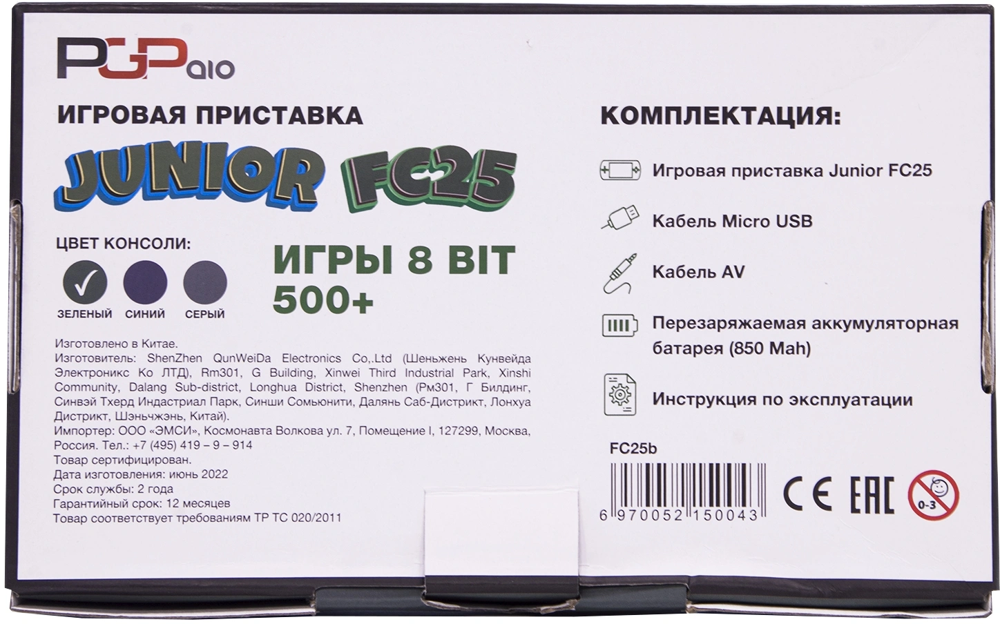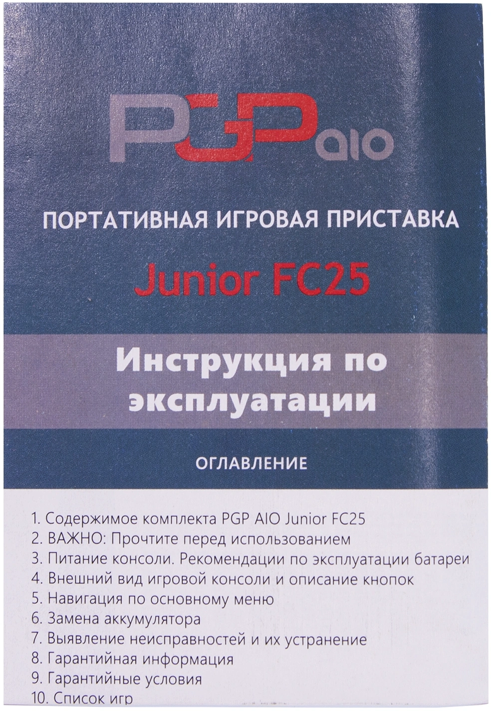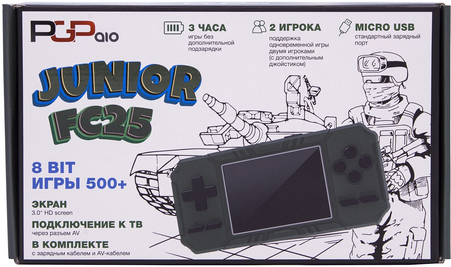 | Комплектация | Игровая приставка Junior FC25, Кабель Micro USB, Кабель AV, Перезаряжаемая аккумуляторная батарея (850 Mah), Инструкция по эксплуатации | |