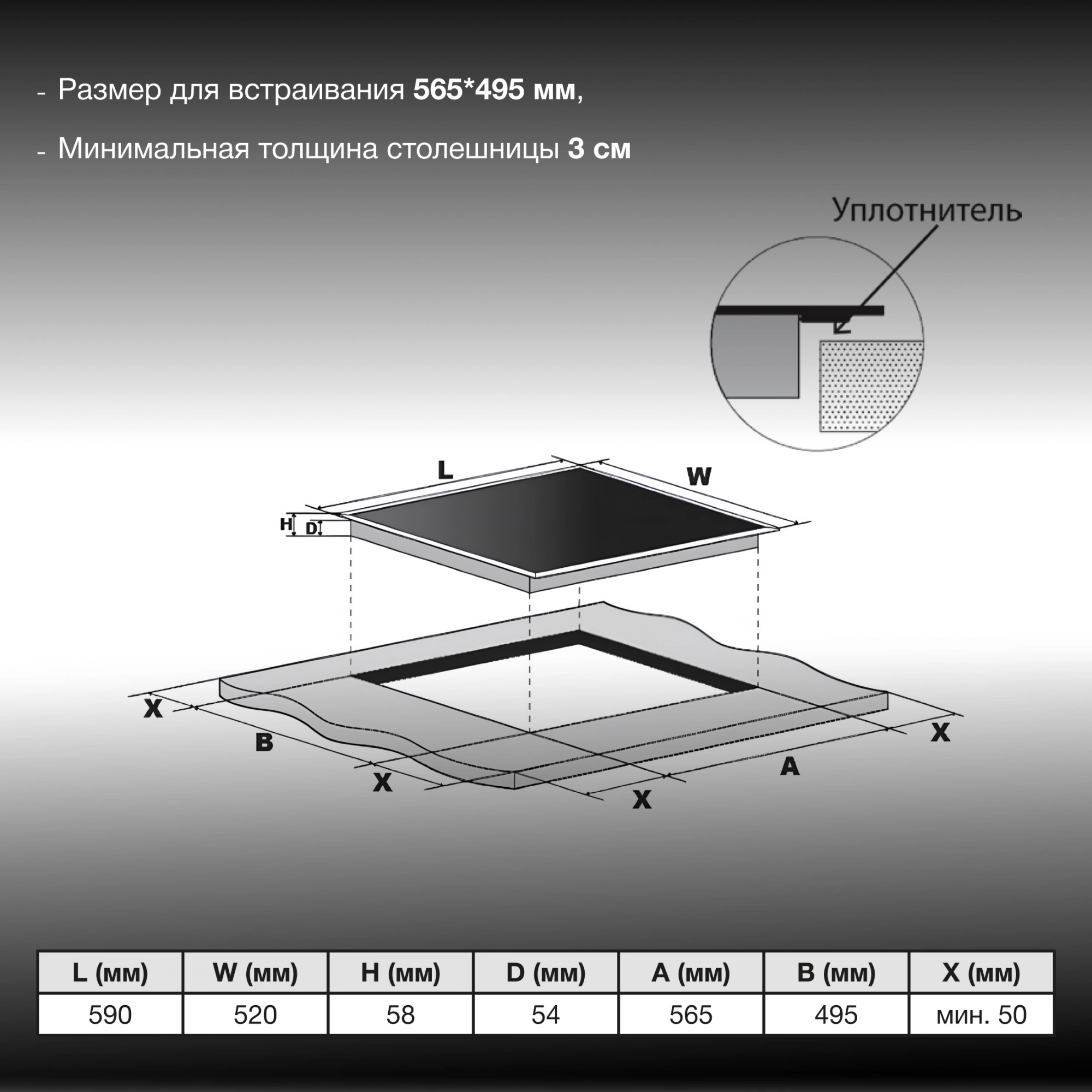 | Размеры для встраивания | 495x565x40мм | |