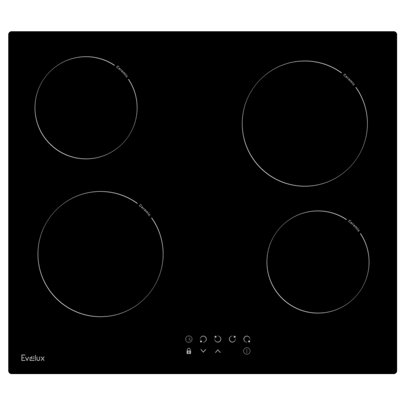 Зоны нагрева Evelux оборудованы современными нагревательными элементами Hi-light. Конфорка достигает установленной рабочей температуры буквально за считанные секунды, позволяет плавно регулировать мощность.