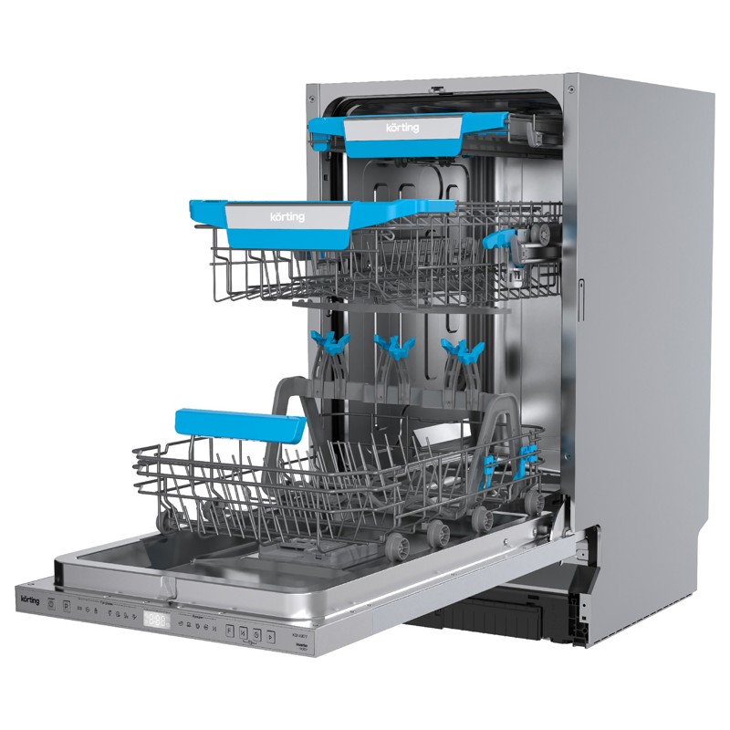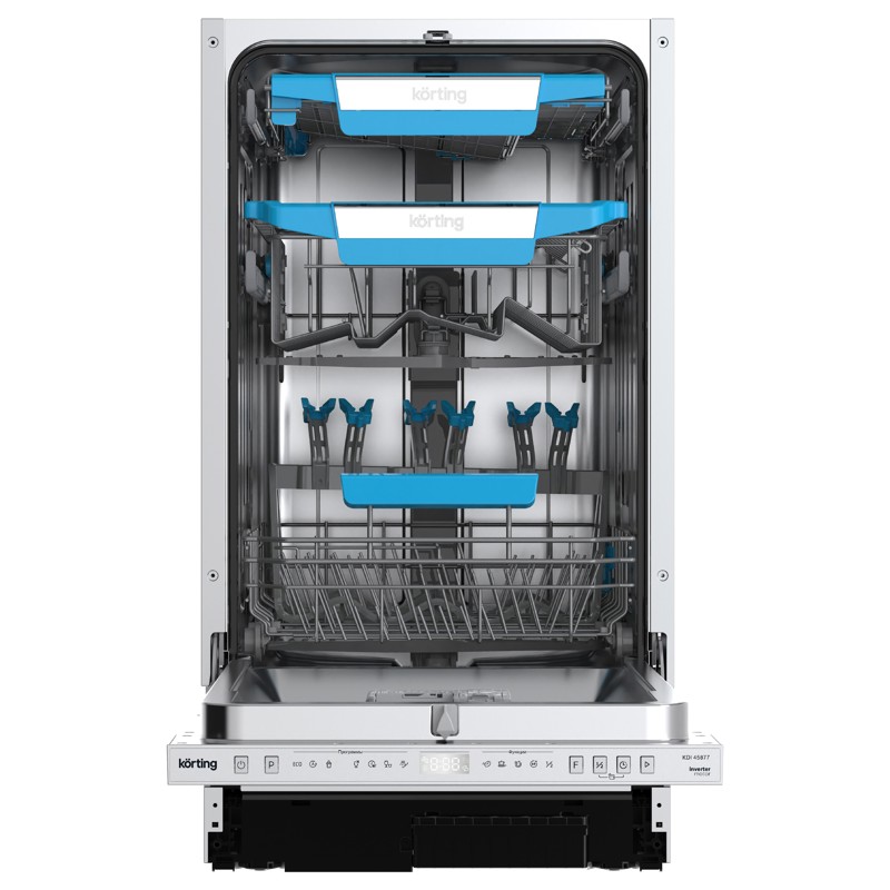 Korting KDI 45877 – это полностью встраиваемая посудомоечная машина, которая сочетает высокую эффективность мытья, низкий уровень шума и продуманный функционал. Благодаря ширине 45 см, она идеально подходит для небольших кухонь, не уступая полноразмерным моделям по качеству очистки посуды.