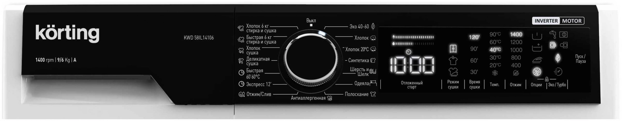 Программы Эко 40-60. Хлопок. Хлопок 20°C. Синтетика. Шерсть и шелк. Одеяла. Полоскание. Антиаллергенная. Отжим/Слив. Экспресс 12'. Быстрая 60' 60°C.