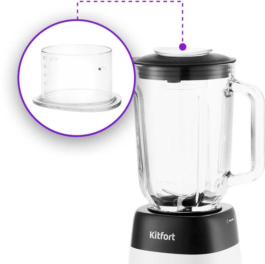 Особенности В крышке чаши блендера есть отверстие для добавления ингредиентов непосредственно во время работы. Колпачок отверстия может использоваться как мерный стакан.
