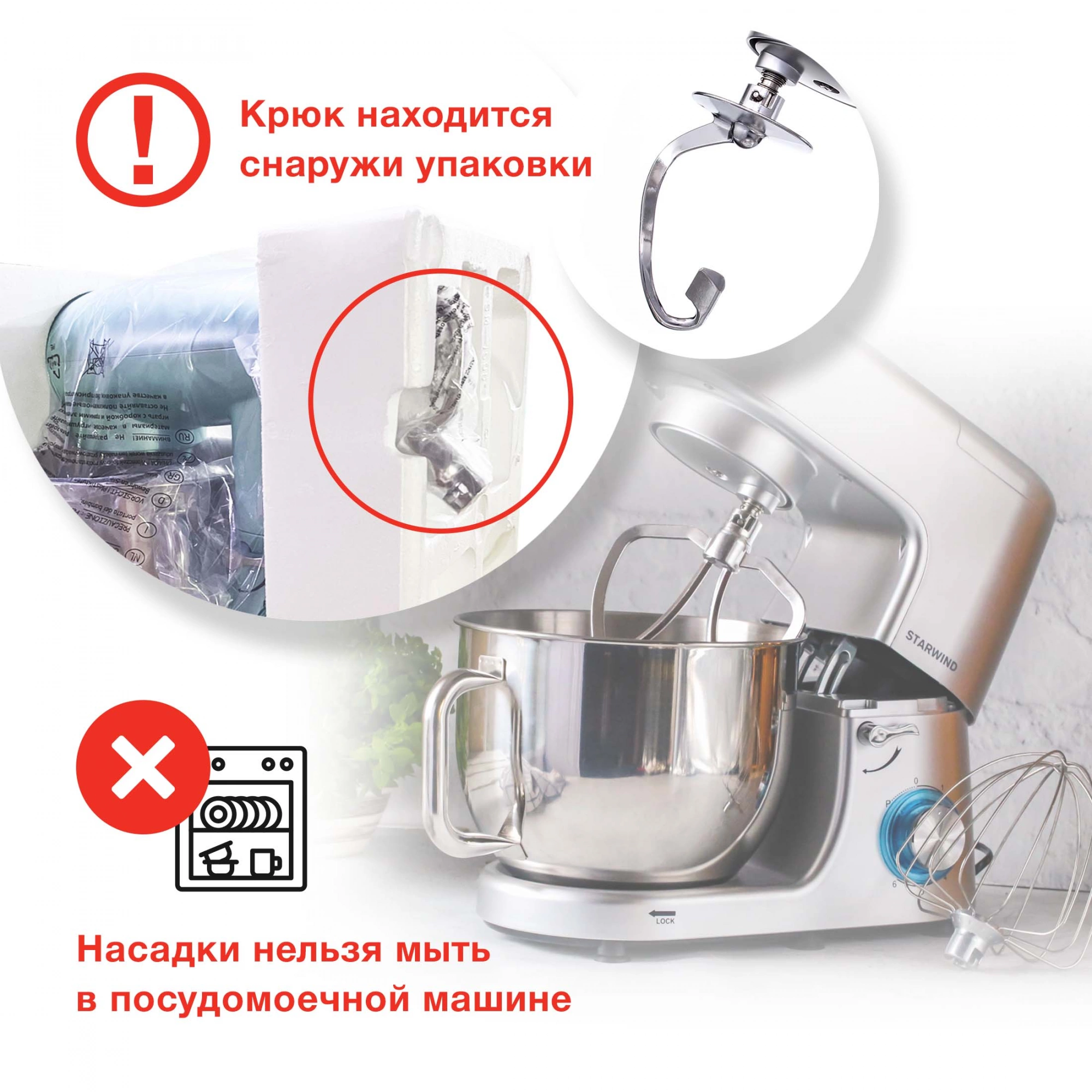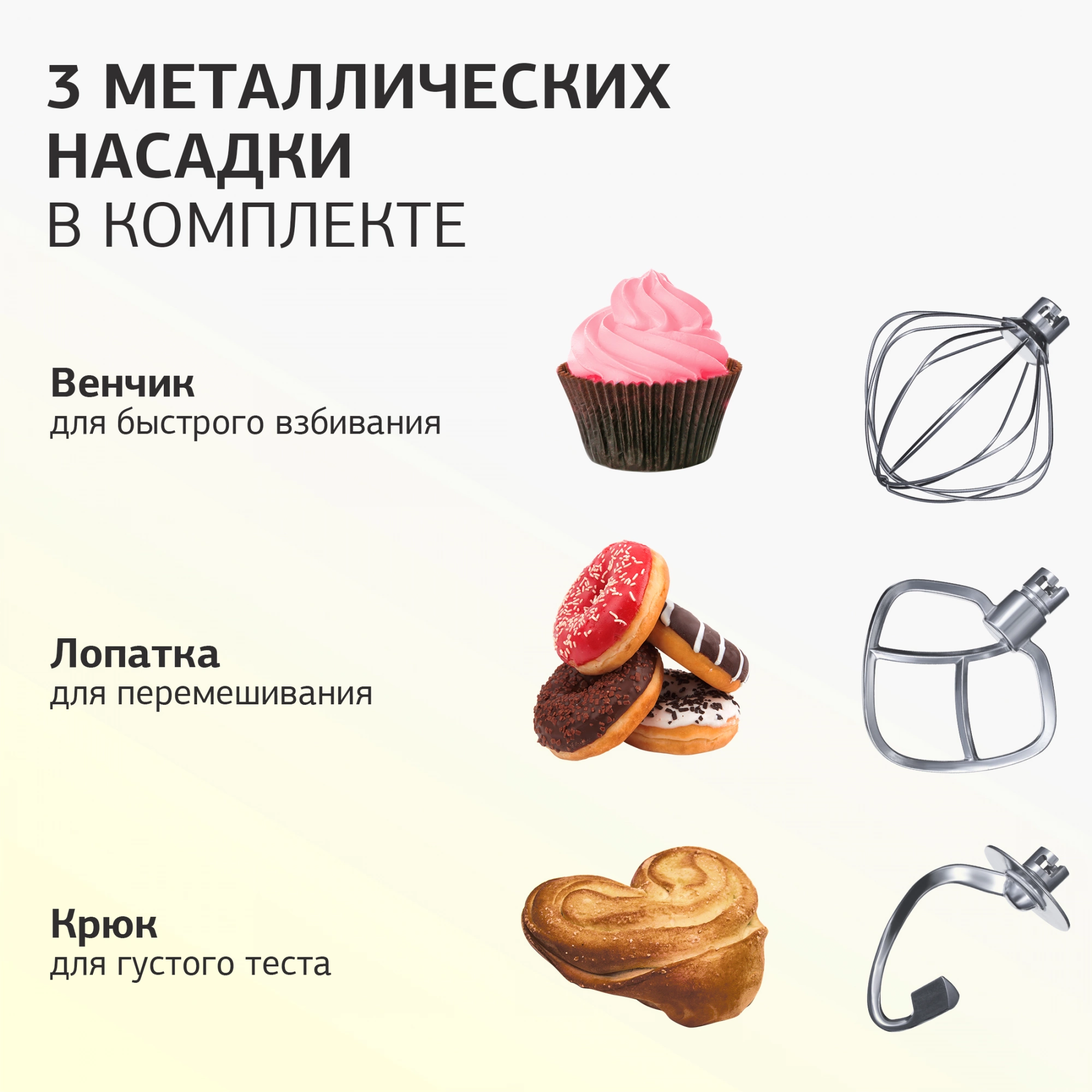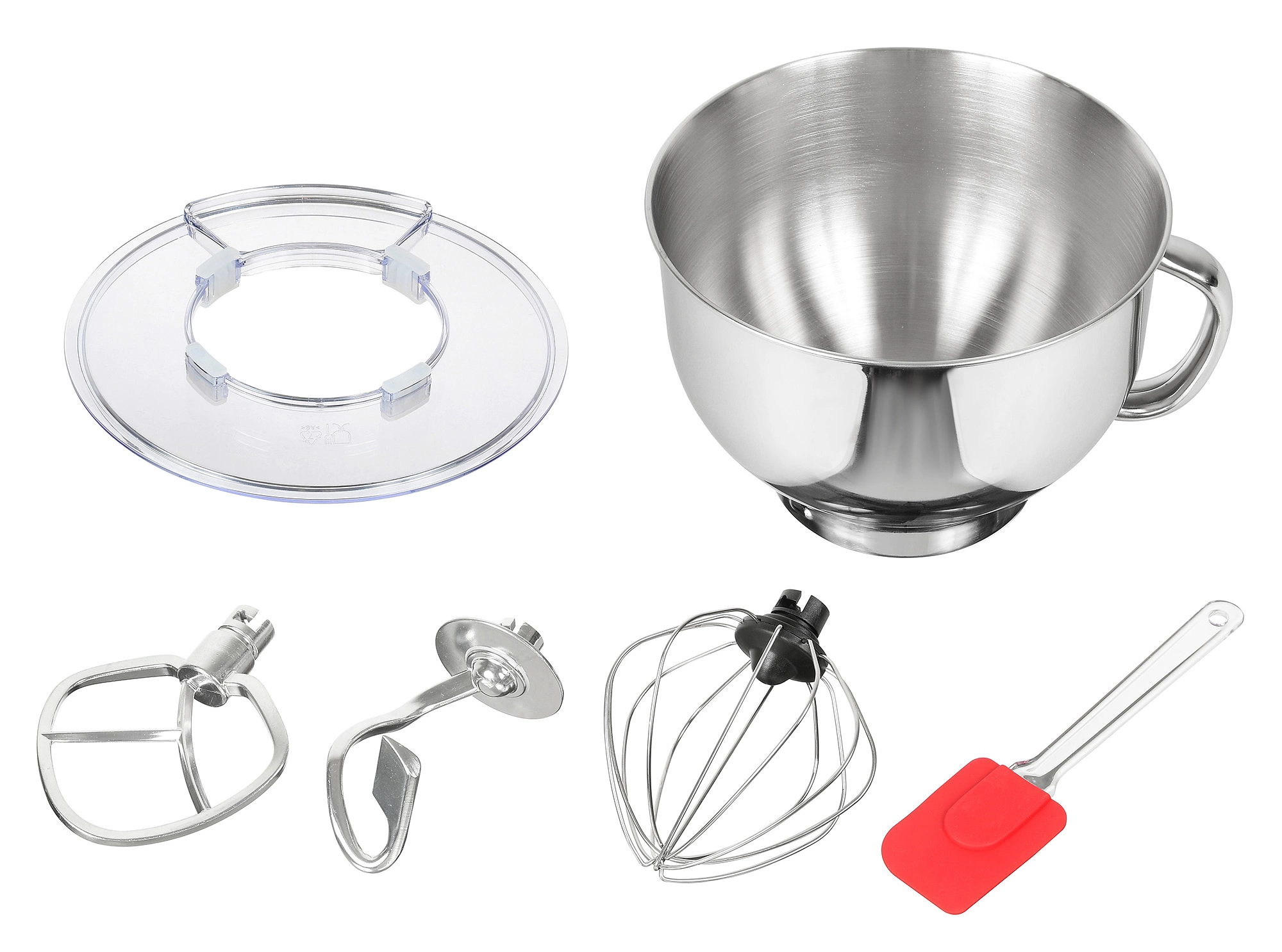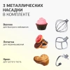 Комплектация Миксер. Чаша (5,5л). Щиток пластиковый. Лопатка для перемешивания. Крюк для замешивания теста. Венчик для взбивания. Кулинарная силиконовая лопатка. Гарантийный талон. Инструкция по эксплуатации.