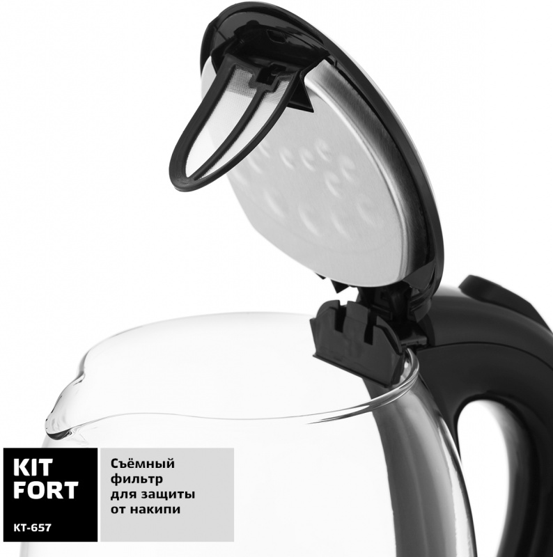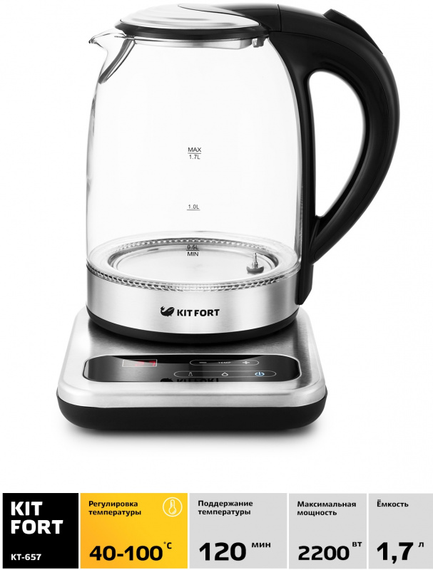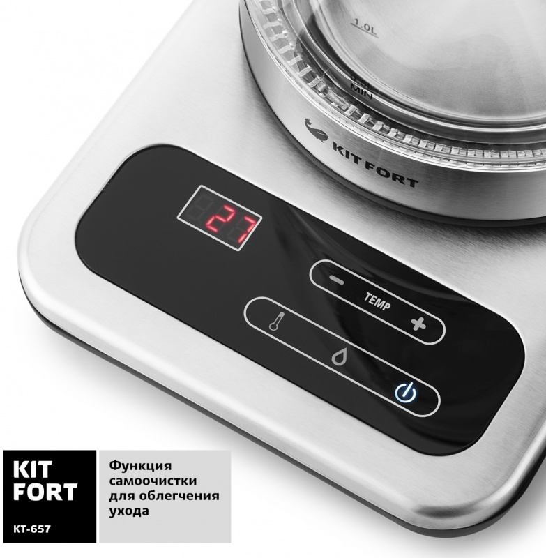 Описание Электрический чайник Kitfort KT-657 с терморегулятором позволит не только вскипятить воду, но и нагреть ее до температуры от 40 до 100 градусов, что очень удобно для заваривания различных сортов чая, кофе или для приготовления детского питания.