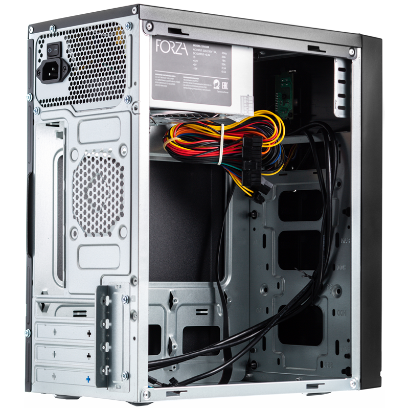 Металлический корпус Foxline Forza FZ-015 имеет простой и выдержанный внешний вид, очень удобное расположение кнопки запуска, а также разъемы USB. Модель имеет уже встроенный блок питания на 450 Вт. Такого показателя мощности хватает для комплектации системного блока дополнительными устройствами (графическая карта, аудиокарта) с очень хорошими техническими показателями. Корпус имеет четыре слота для установки дополнительных плат. Производитель предусмотрел возможность добавления вентиляторов для улучшенного обмена воздушными потоками.