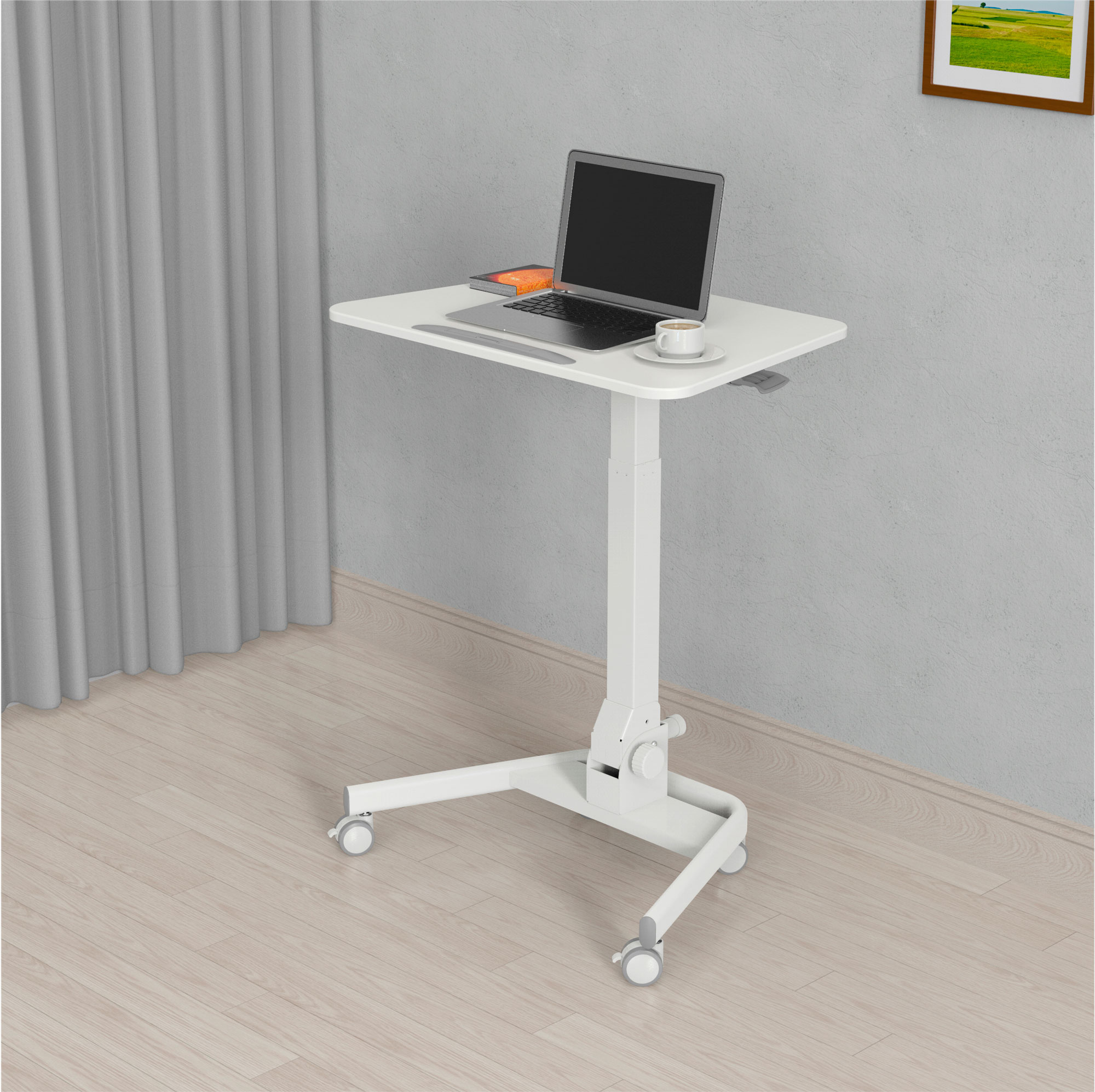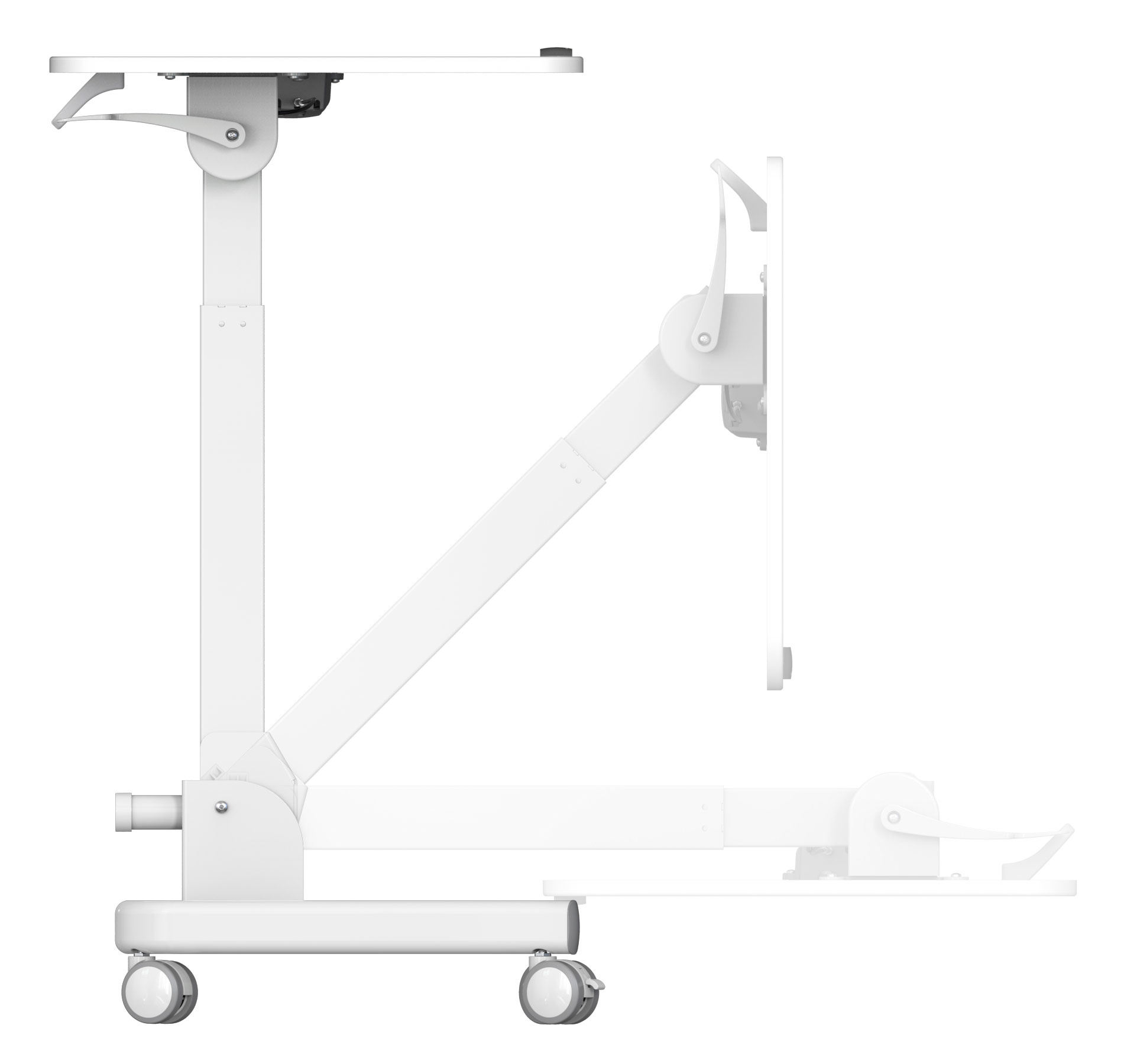 | Особенности | Простое управление: подъемный механизм плавно опускает и поднимает столешницу, можно остановить в любом положении. Наличие 4 колес обеспечивает маневренность, 2 колеса со стопором, для придания устойчивости. Полностью складной стол, удобное хранение и транспортировка. | |