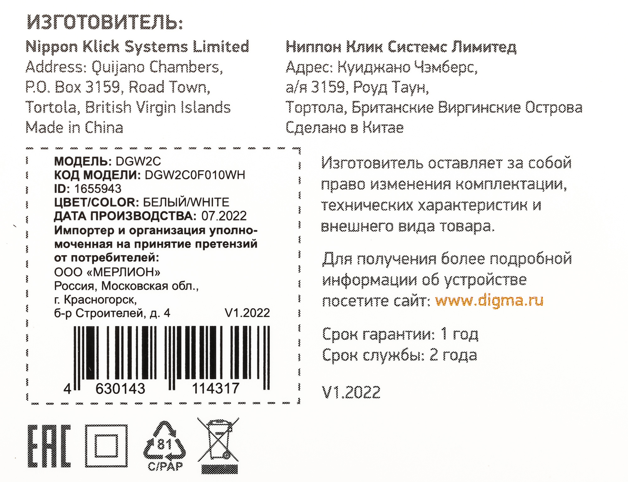 | PartNumber/Артикул Производителя | DGW2C0F010WH | |