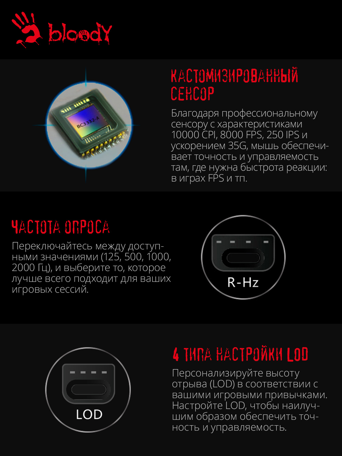 | Особенности | игровой сенсор MAX BC3332-A, регулировка высоты отрыва. при установке ПО Bloody7, уровни core3,4 активированы бесплатно | |
