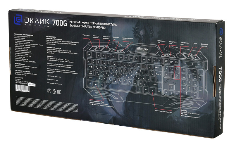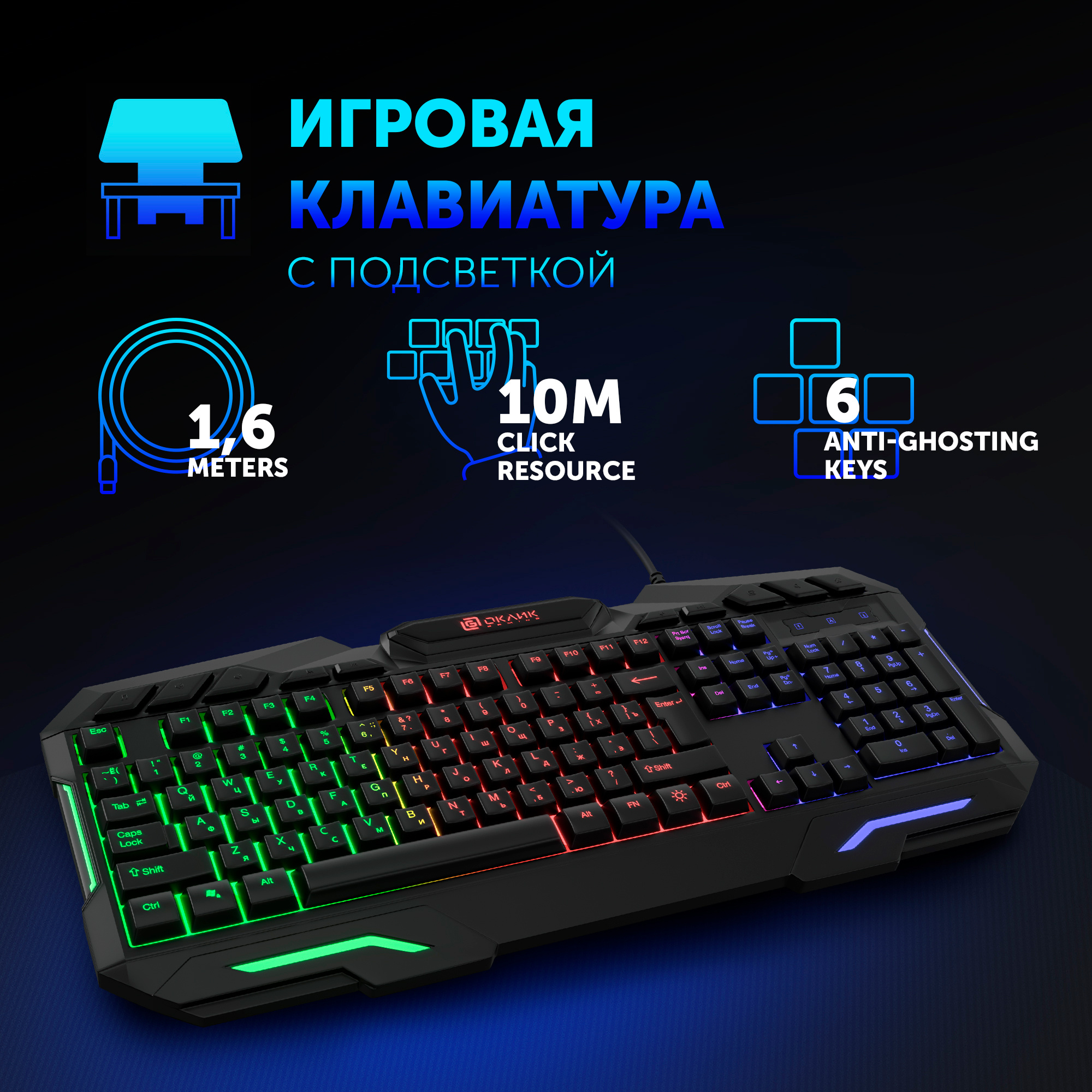 | Особенности | Anti-Ghosting: одновременное нажатие до 26 клавиш, многоцветная подсветка, 3 цвета подсветки, ресурс клавиш до 10 000 000 нажатий | |