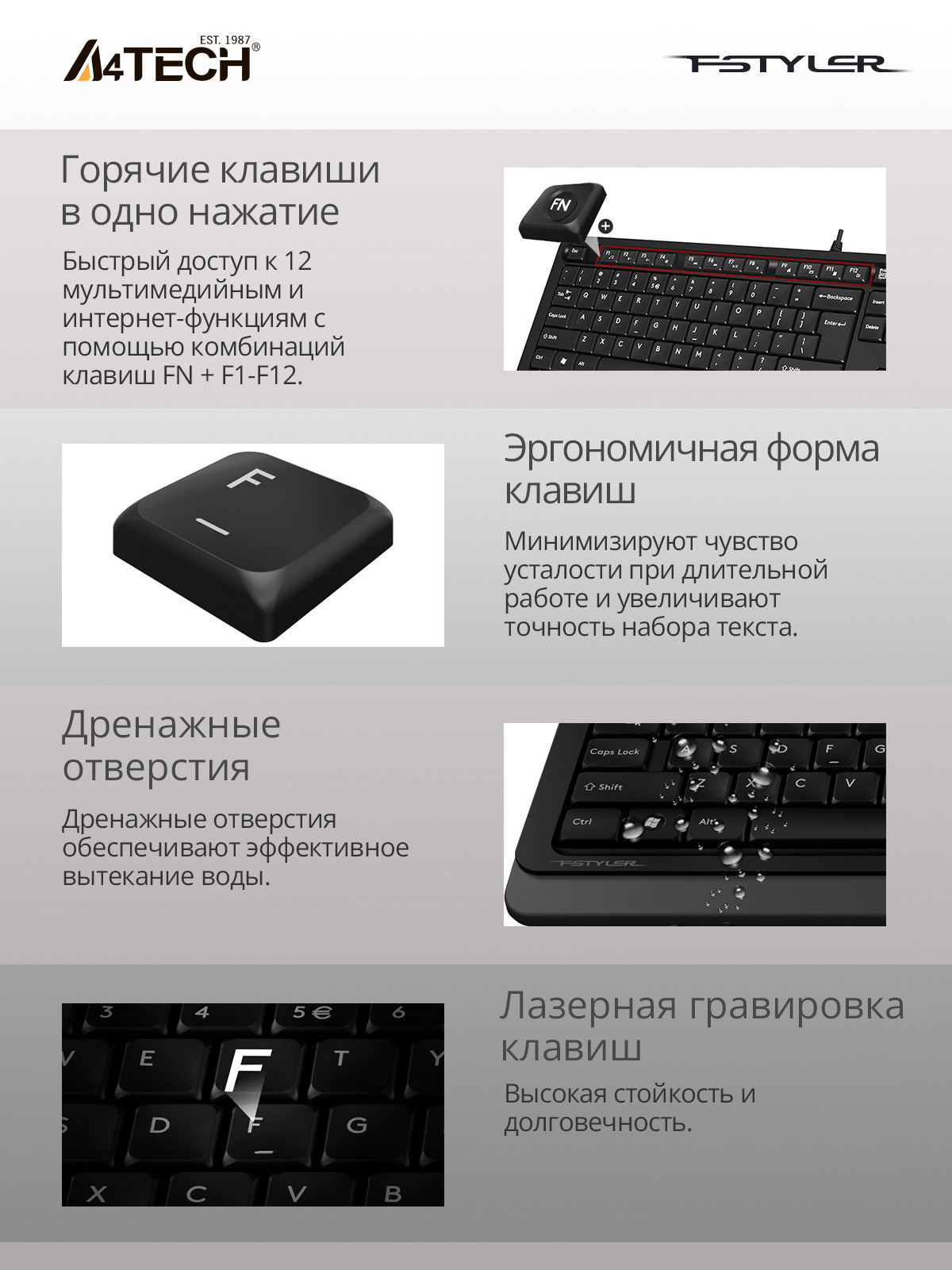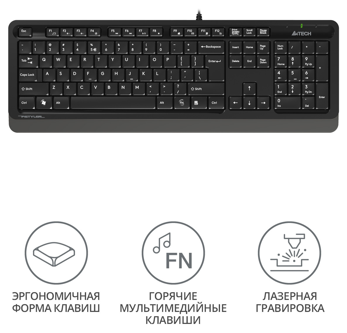 | Особенности | Эргономичная форма клавиш минимизирует чувство усталости при длительной работе и увеличивает точность набора текста. | |