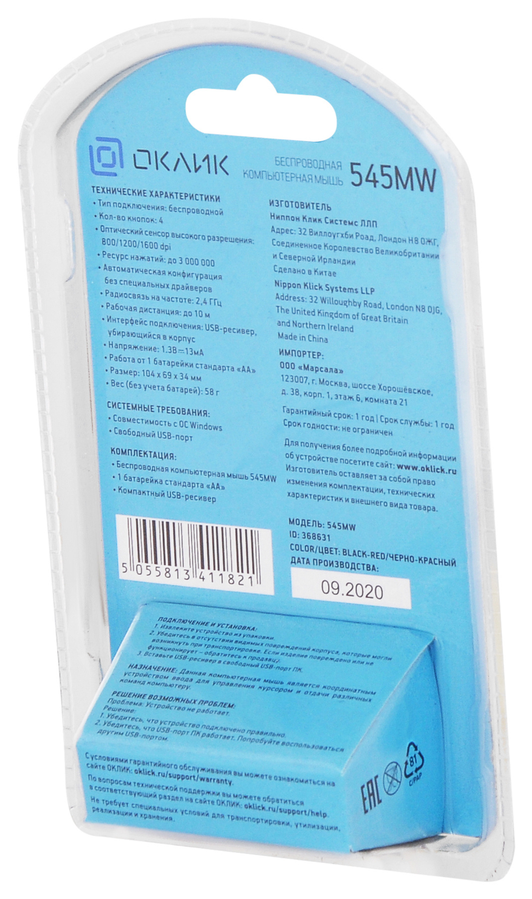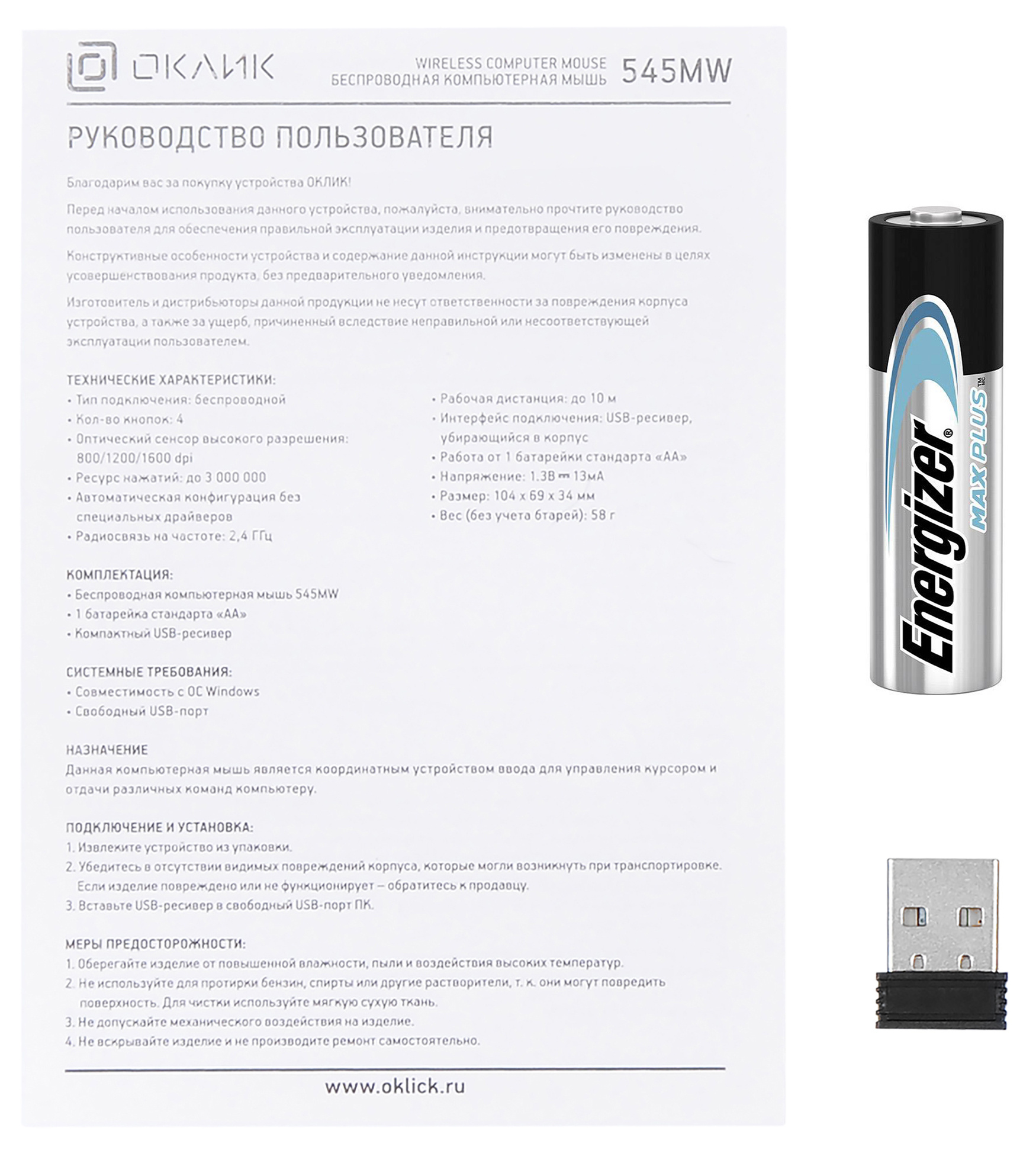 | Комплект поставки | Беспроводная компьютерная мышь 545MW 1 батарейка стандарта AA Компактный USB-ресивер | |
