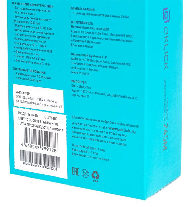 | Комплект поставки | Проводная компьютерная мышь 245M | |
