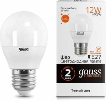 Лампа светодиодная Gauss Elementary 12Вт цок.:E27 шар 220B 3000K св.свеч.бел.теп.