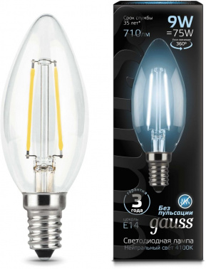 Лампа филам. Gauss Filament 9Вт цок.:E14 свеча 220B 4100K св.свеч.бел.ней.