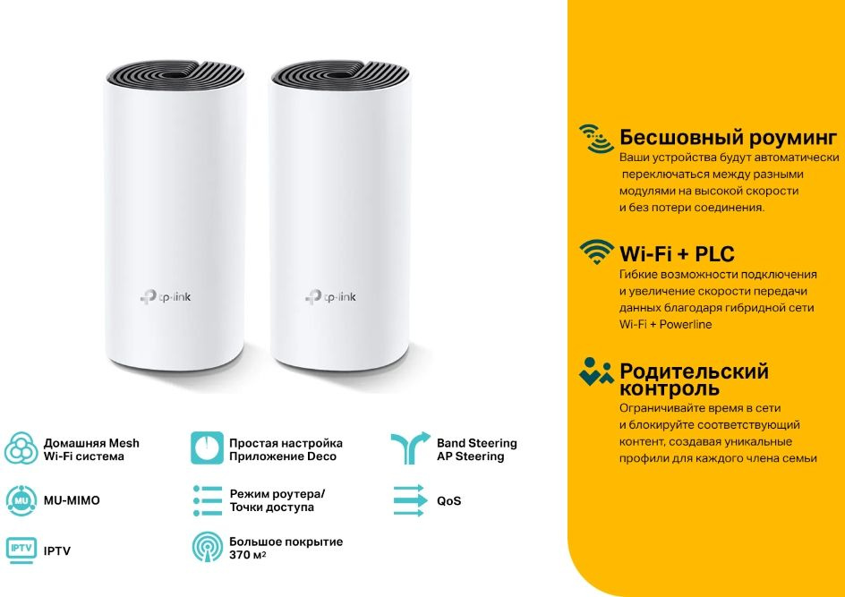 | Преимущества. | Deco P9 совместим с другими моделями Deco для формирования Mesh-сети. Увеличьте зону покрытия Mesh Wi-Fi в любой момент, просто добавив больше модулей Deco. Интуитивно понятная функция родительского контроля позволит без проблем оградить детей от нежелательного онлайн?контента. | |