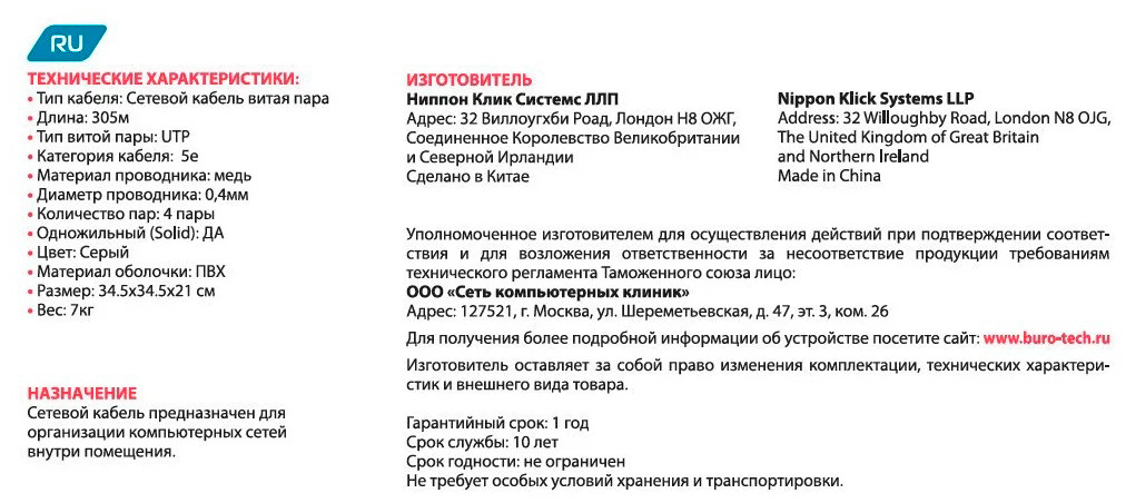 | Тип | Кабель сетевой | |