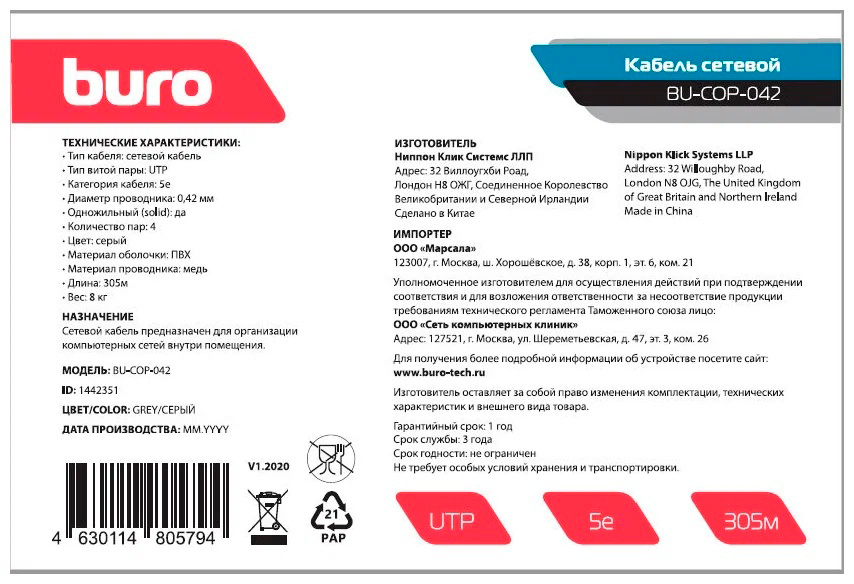 | Тип | Кабель сетевой | |