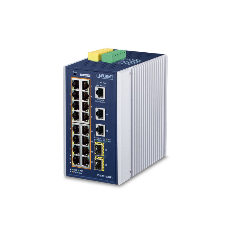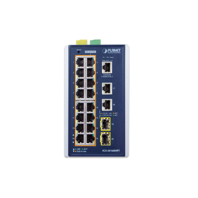 Промышленный управляемый коммутатор PoE+ PLANET IGS-20160HPT L3, оснащенный 16 портами 10/100/1000BASE-T 802.3 at PoE+ с мощностью каждого порта до 36 Вт и портами SFP 100/1000/2500BASE-X в прочном металлическом корпусе IP30, может быть установлен в любой суровой среде. Он обеспечивает удобные в использовании, но продвинутые интерфейсы управления IPv6/IPv4, широкие функции коммутации L2/L4, возможность динамической маршрутизации уровня 3 OSPFv2 и передовую кольцевую технологию ERPS ITU-G. 8032 для улучшения возможности быстрого самовосстановления и интеллектуальных функций PoE для управления наружным IP-наблюдением PoE и приложениями беспроводной сети. Он способен надежно, стабильно и бесшумно работать в диапазоне температур от -40 до 75 градусов С.