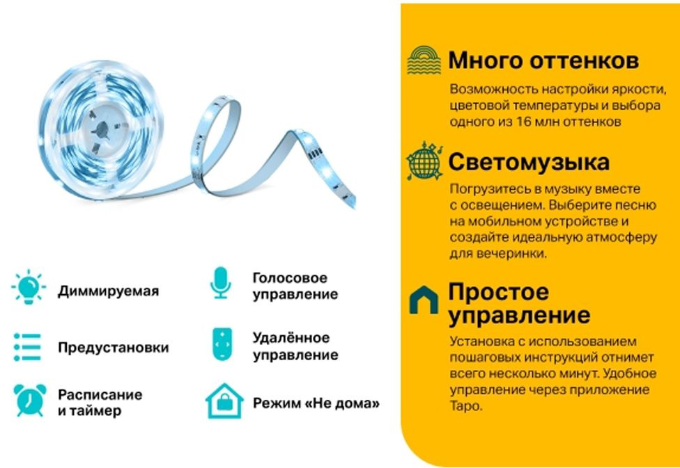 | Возможности | Голосовое управление — управляйте светом голосовыми командами при помощи Маруси, Яндекс Алисы или Google Ассистента. Удалённое управление светом из телефона через приложение Tapo. Режим «Не дома» — создание видимости присутствия в доме людей для отпугивания незваных гостей. | |