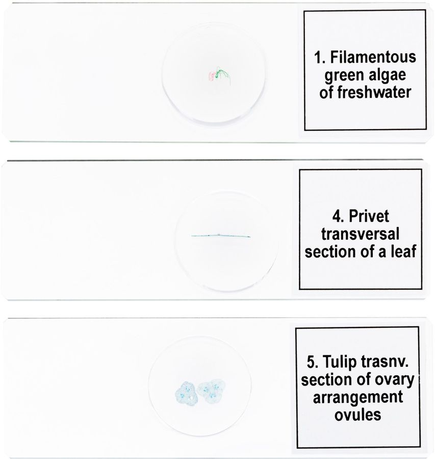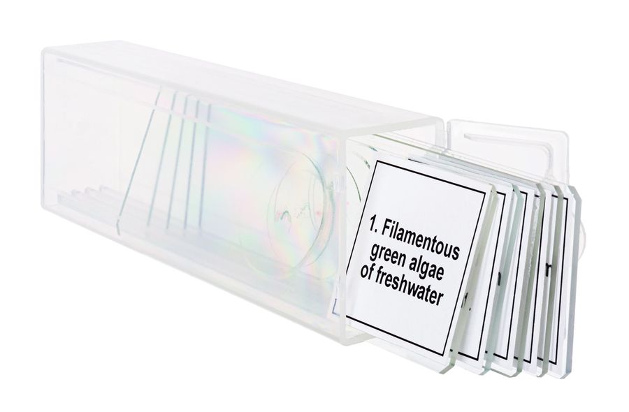 | Комплектация | Зеленые нитчатые пресноводные водоросли. Хлебная плесень с мицелием и спорангием. Корень подсолнуха, поперечный срез. Лист бирючины, поперечный срез. Семяпочка в завязи тюльпана, поперечный срез | |