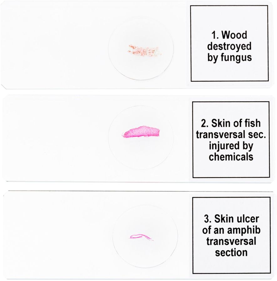 | Комплектация | Древесина, разрушенная грибком. Кожа рыбы, поврежденная химикатами, поперечный срез. Язва на коже амфибии, поперечный срез. Части растений, пораженные тлей, поперечный срез. Галл, вызванный тлей, поперечный срез. | |