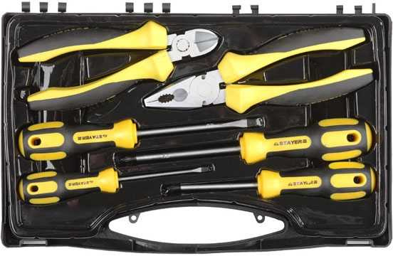 Описание Профессиональный набор инструментов STAYER включает в себя наиболее необходимые инструменты. Инструменты изготовлены из высококачественной инструментальной стали. Рабочие поверхности инструмента закалены. Противоскользящие рукоятки создают максимальное удобство при работе.