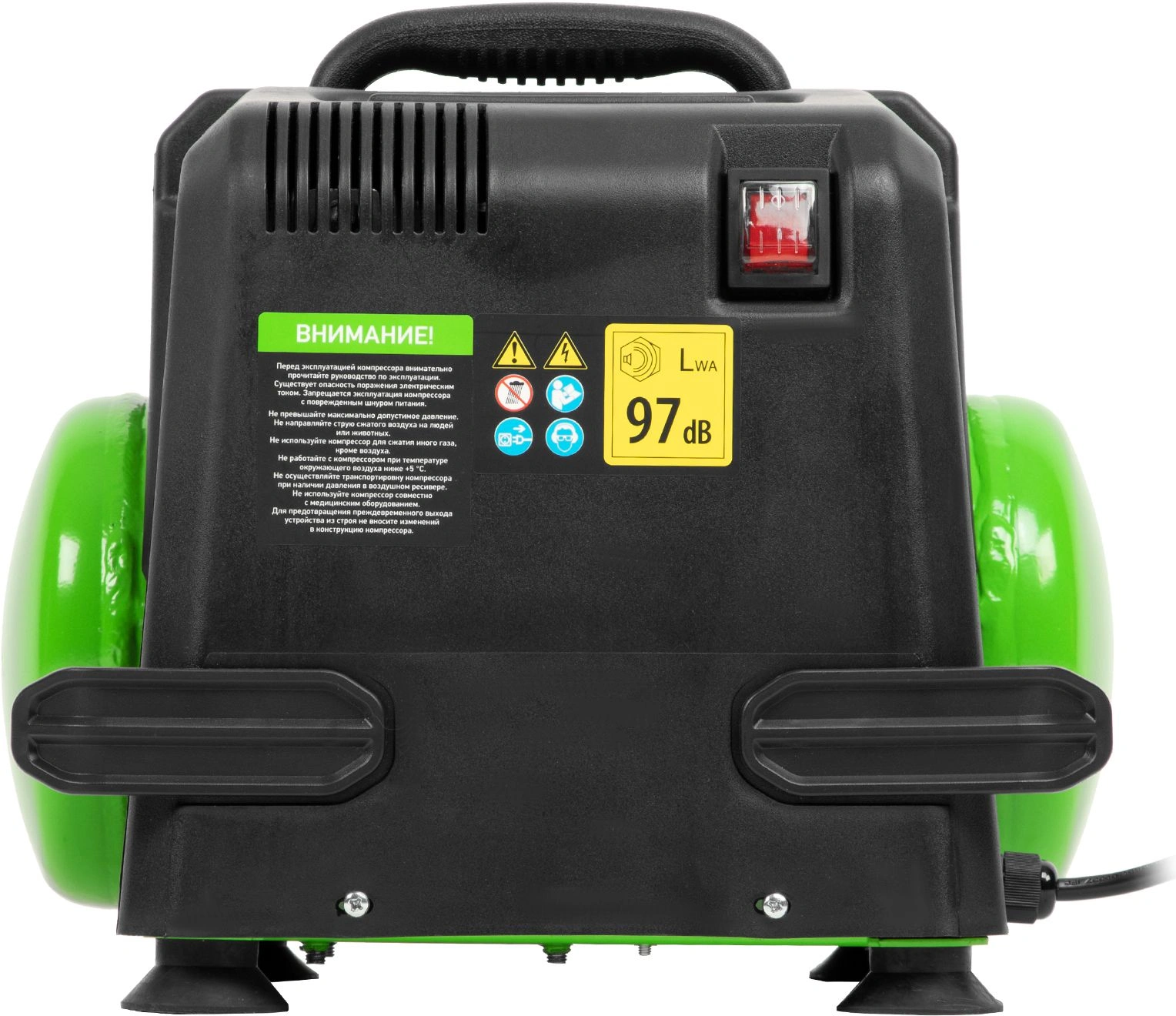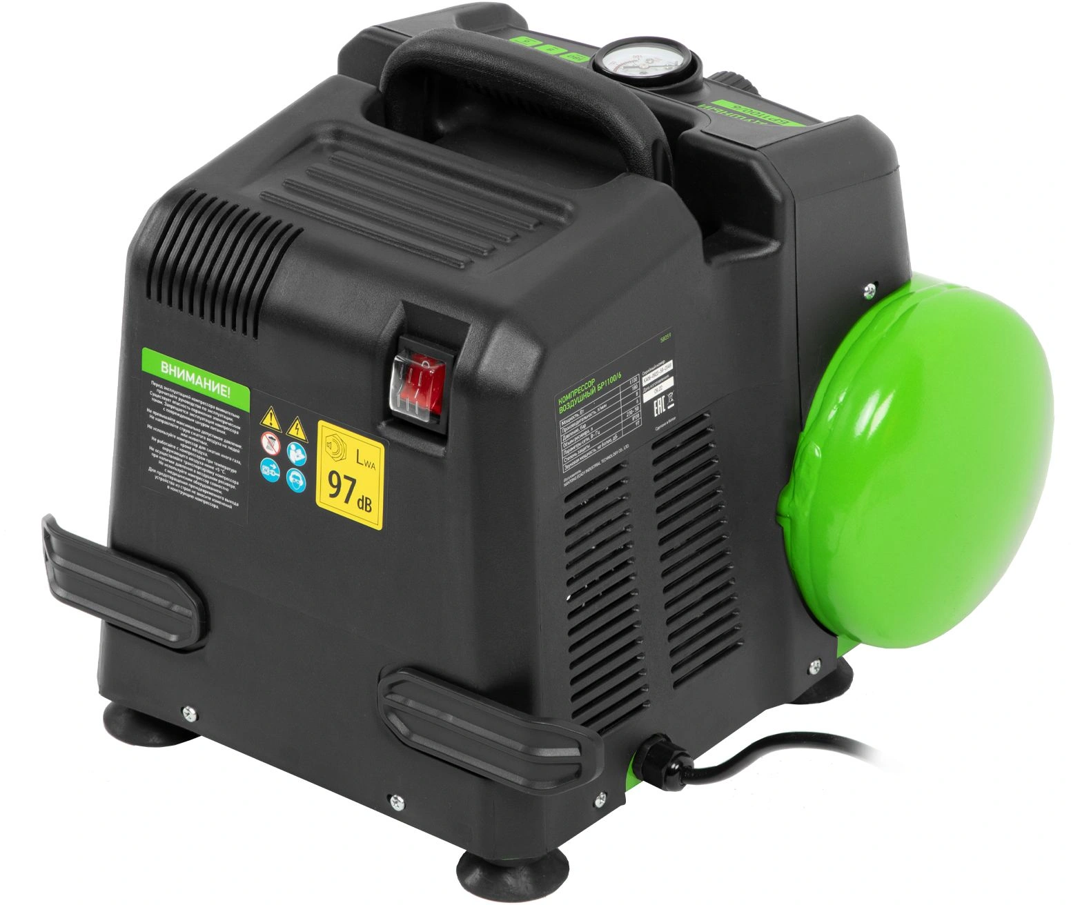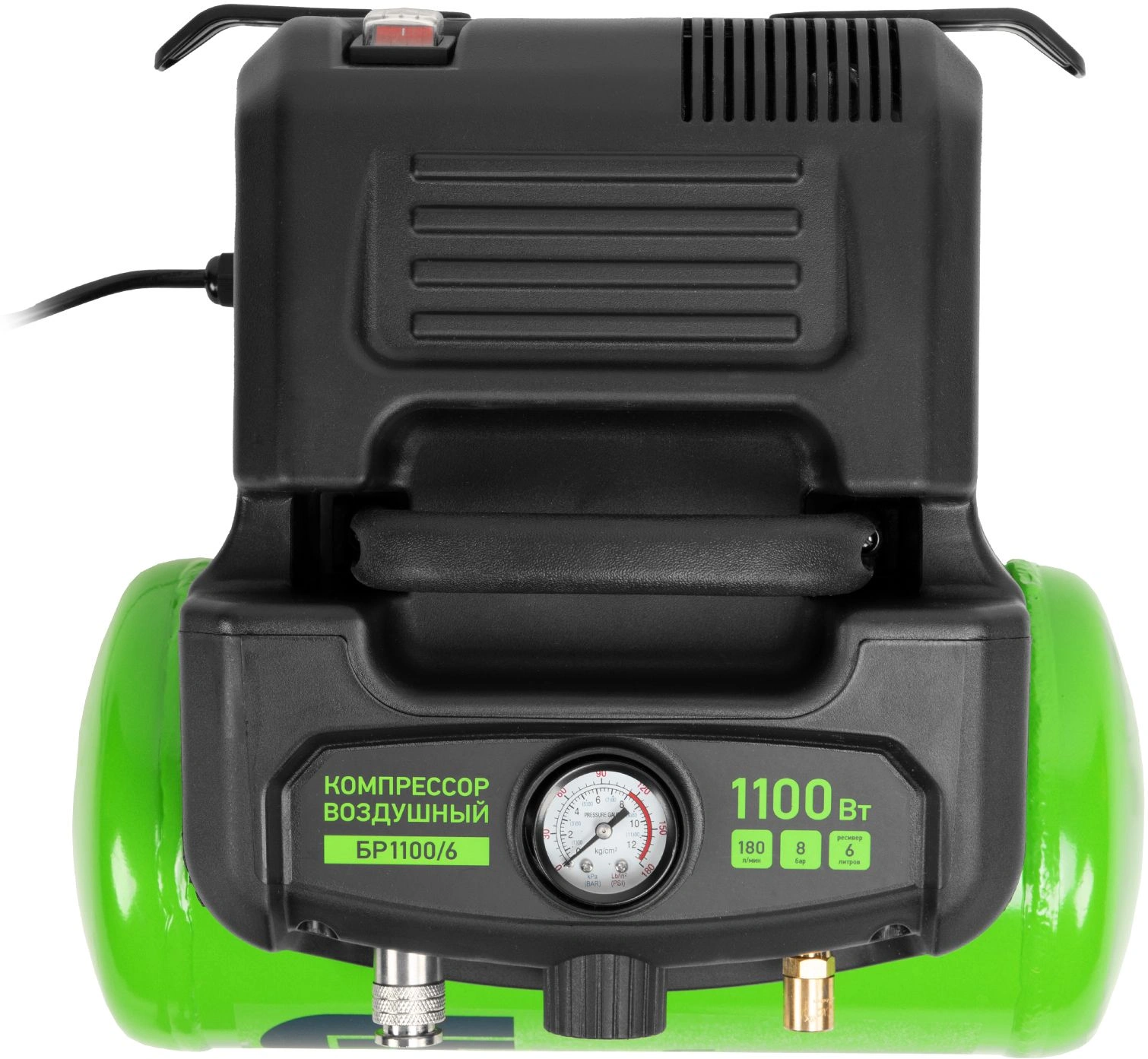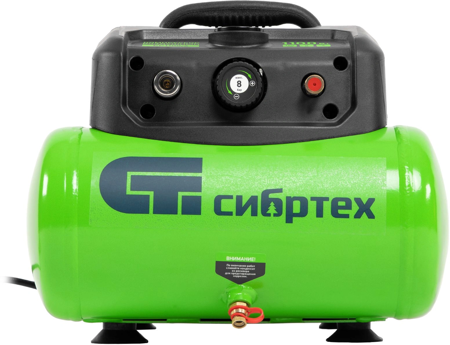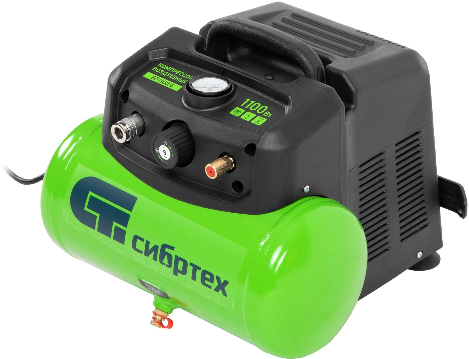 Воздушный безмасляный компрессор Сибртех BL 1100/6 58059 мощностью 1100 Вт, с ресивером емкостью 6 литров, служит для подачи сжатого воздуха под давлением до 8 бар со скоростью 180 л/мин. К нему можно подключить краскораспылитель, продувочный пистолет, заклепочник, пистолет для накачки шин и другой пневмоинструмент. Отсутствие масла делает компрессор оптимальным для выполнения покрасочных работ и продувки электронных компонентов. Устройство предназначено для бытового использования.Одна из основных особенностей данной модели — компактность и удобство в перевозке. Компрессор отличается небольшим весом и дополнен эргономичной транспортировочной ручкой.ПреимуществаАвтономность — прессостат обеспечивает автоматический запуск двигателя и его остановку в зависимости от уровня давления в ресивере.Простая подготовка к работе — быстроразъемный выходной коннектор «Рапид» (евро) позволяет легко подключить пневмоинструмент.Удобное управление — при помощи поворотного регулятора на передней панели можно установить нужное значение давления.Контроль давления в ресивере — в верхней части корпуса расположен манометр, для считывания показателей не нужно наклоняться.Предохранительный клапан — возможность сброса избыточного давления позволяет избежать аварийных ситуаций.Продуманная конструкция — виброгасящие опоры обеспечивают устойчивость компрессора во время работы.