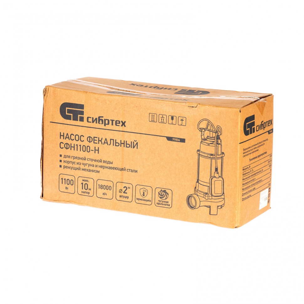 Фекальный насос Сибртех СФН1100-Н 99804 с ножом имеет мощность 1100 Вт и производительность до 18000 л/ч, обеспечивает напор до 10 м, подходит для шлангов диаметром 2 дюйма и применяется для работы с чистой или грязной водой на глубине погружения до 5 м. Используется для перекачки жидкости из стоков, выгребных ям, емкостей и водоемов, а также для аварийной откачки воды из подвалов, погребов, траншей, котлованов. Его можно использовать для организации систем полива на даче. Насос оптимален для установки в канализационной системе: специальный нож измельчает крупные частицы, что позволяет избежать засорения. Также работает с холодными стоками, при этом температура жидкости не должна превышать 35 градусов.ПреимуществаАвтономность — поплавковый выключатель не допускает работы насоса на сухом ходу, участие пользователя при этом не требуется.Монтаж без специальных навыков — насос погружается в колодец с помощью троса и фиксируется в вертикальном положении.Термозащита — при перегреве двигатель отключается, что предотвращает его поломку.Надежность — корпус из чугуна и нержавеющей стали выдерживает эксплуатацию в агрессивной среде.Износостойкость — насосная часть изготовлена из чугуна, что уменьшает риск ее выхода из строя при работе с сильно загрязненными жидкостями.Герметичность — насос имеет степень защиты IPX8, поэтому его электронные компоненты надежно защищены от воды.Устойчивость — ножки на корпусе позволяют избежать опрокидывания насоса.Удобное перемещение — благодаря ручке насос легко транспортировать.