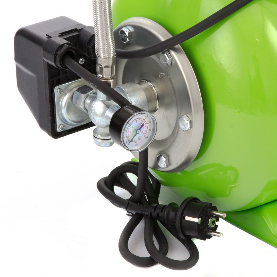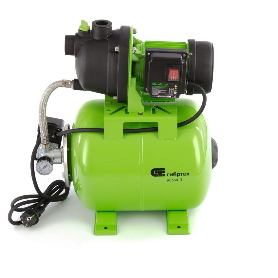 Насосная станция Сибртех НС650-П 97247 мощностью 650 Вт, с ресивером на 19 л, обеспечивает напор воды до 37 м и применяется для организации водоснабжения в частных домах и дачных коттеджах. Также подходит для стабилизации напора воды в квартирах. Надежный электродвигатель на 650 Вт обеспечивает скорость перекачивания до 53 л/мин под давлением до 2,8 бар.Насосная станция оснащена ресивером, поэтому двигатель включается только после израсходования накопленного запаса воды. Автоматизация рабочего процесса позволяет разумно потреблять как воду, так и электроэнергию.ПреимуществаТермозащита — в случае превышения допустимой температуры термодатчик отключает электродвигатель, обеспечивая его сохранность.Степень защиты IPX4 — насос не подвержен поломкам из-за попадания водяных брызг.Гидроизолированный тумблер — прозрачный кожух защищает выключатель от попадания влаги и пыли во внутренний узел.Автоконтроль давления — специальное реле отвечает за остановку двигателя при достижении максимального показателя в 2,8 бар и автоматический запуск при падении ниже 1,4 бар — так продлевается ресурс электрокомпонентов и предотвращается превышение давления в системе.Оснащение манометром — пользователю удобно контролировать давление воды в системе.Объемный ресивер — резервуар позволяет накапливать до 19 л воды и всегда иметь запас на случай отключения электричества.Компактность — насосная станция сделана в виде небольшого блока, это позволяет устанавливать ее даже в ограниченном пространстве.Устойчивость — станция фиксируется на двух опорах, также ее положение можно укрепить болтами для устранения вибраций.