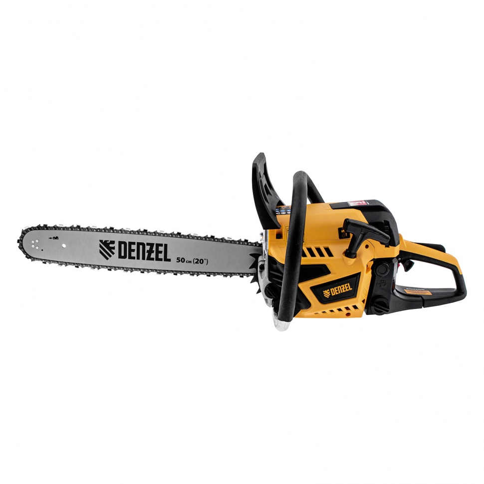 Пила цепная бензиновая Denzel DS-5820 95238 мощностью 3,6 л.с. оснащена двигателем объемом 58 см3 и поставляется с высокопроизводительной пильной гарнитурой: шиной длиной 50 см, цепью с 76 звеньями шагом 0,325"" и пазом 1,5 мм. Используется для заготовки дров, распиловки древесины, при проведении ремонтных, строительных и садовых работ. Мощный и экономичный двухтактный двигатель позволяет эффективно и быстро решать поставленные задачи.ПреимуществаБезопасная работа — блокировка от случайного запуска и моментальное срабатывание тормоза цепи при отскоке пилы снижают вероятность получения травм.Облегченный запуск двигателя — система Easy start и праймер для подкачки топлива позволяют быстро приступить к работе даже после долгого перерыва.Система автоматической смазки цепи — масло подается к пильной гарнитуре своевременно и в необходимом количестве, что позволяет уменьшить ее изнашивание и препятствует накапливанию смолы.Точный рез без лишних усилий — зубчатый упор из высококачественной стали позволяет надежно фиксировать пилу во время работы и снижает отдачу.Аварийная остановка — при необходимости двигатель можно быстро отключить, нажав на выключатель.Надежный хват — задняя и прорезиненная передняя рукоятки удобно ложатся в руки, позволяя работать с комфортом.Оптимизированная антивибрационная система — позволяет снизить вредное воздействие вибрации на организм.Отсек для хранения свечного ключа — инструмент всегда находится под рукой и не потеряется.Быстрый доступ к воздушному фильтру — для его осмотра и очистки не нужно сдавать инструмент в сервисный центр.Полный комплект поставки — инструменты для обслуживания, свечной ключ и емкость для приготовления топливной смеси прилагаются к пиле.Комфортная эксплуатация — пила отличается компактностью (44 х 26,5 х 34,5 см).Удобное хранение и транспортировка — шина поставляется в защитном чехле.Гарантия 3 года — высокое качество бензопилы подтверждено производителем.