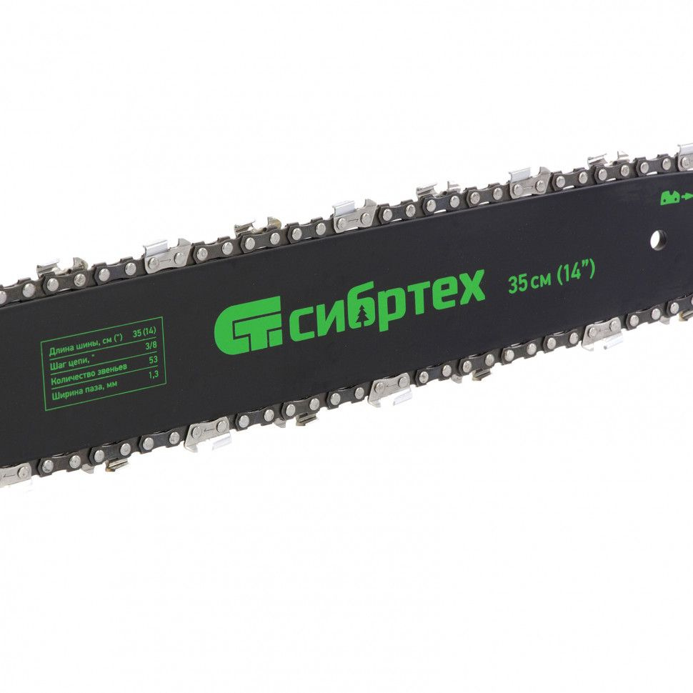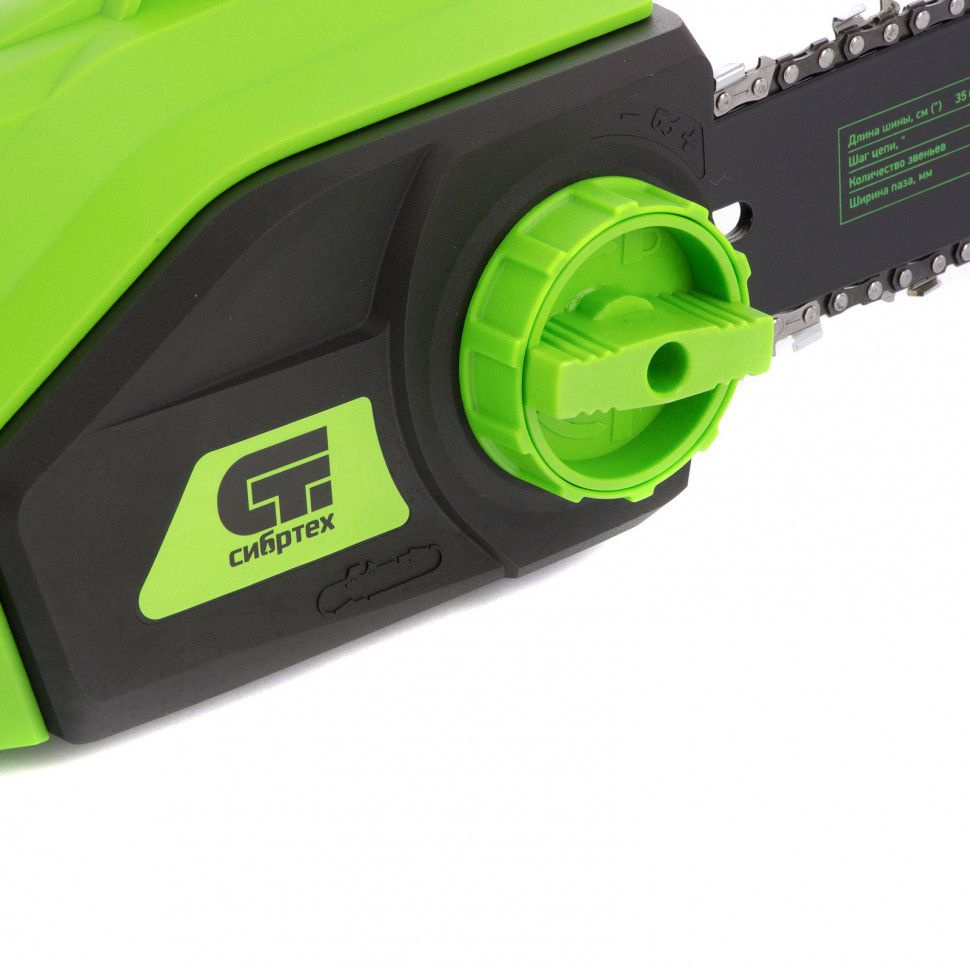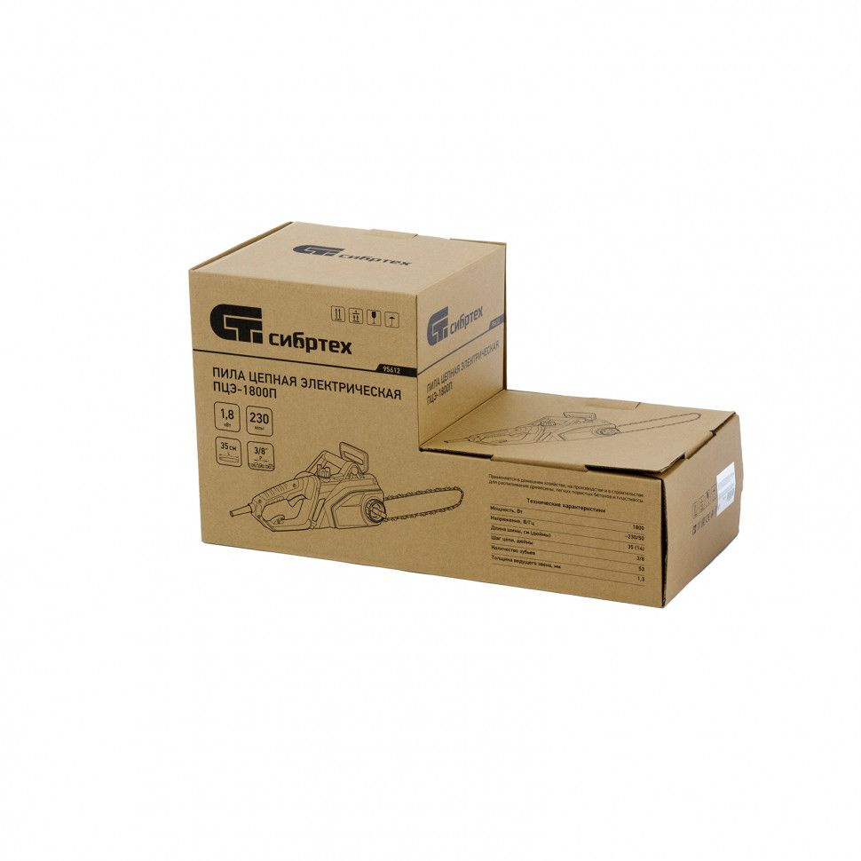 Бытовая электрическая пила Сибртех ПЦЭ-1800П предназначена для эксплуатации в саду, проведения ремонтных, строительных и хозяйственных работ. Двигатель мощностью 1.8 кВт обеспечивает скорость вращения цепи 13.5 м/с и позволяет эффективно решать поставленные задачи.Пила работает от электрической сети, поэтому она экологична и не вредит окружающей среде опасными выхлопами. Она не требует приготовления топливной смеси и умения работы с бензиновым двигателем. Инструмент готов к работе сразу после приобретения и может использоваться не только на открытом воздухе, но и в помещении.Преимущества:Поперечное расположение двигателя помогает успешно справиться с пилением в вертикальной плоскости, например, с заготовкой дров. Также это решение позволяет снизить вес пилы и снять нагрузку с оператора.Пила оснащена клавишей защиты от случайного включения, поэтому оператор не получит травм из-за непроизвольного запуска двигателя.Ручка инерционного тормоза автоматически блокирует вал и останавливает вращающуюся цепь в случае резкой отдачи и отскока пилы на пользователя. Это помогает избежать соприкосновения с острыми звеньями и порезов.Медная обмотка двигателя имеет меньшее удельное сопротивление по сравнению с алюминиевой, тем самым обеспечивает более стабильные характеристики двигателя при высоких нагрузках.Вентиляционные отверстия способствуют эффективному охлаждению двигателя и предупреждают его поломку при работе летом или сложном распиливании.Фурнитура произведена из высокопрочной стали: цепь закалена до твердости 65 HRC, шина - до 35-40 HRC. Контроль термообработки стали позволяет реже затачивать детали и выполнять поставленные задачи эффективно.Система SDS - натягивать шину можно одной рукой без дополнительного инструмента, это значительно облегчает обслуживание электропилы.Шестерни редуктора сделаны из устойчивого к повреждениям металла, а в случае необходимости легко снимаются. Это обеспечивает высокий ресурс пилы и ремонтопригодность деталей.Зубчатый упор надежно фиксирует пилу при разрезании больших бревен или деревьев и помогает не только снять нагрузку с оператора, но и выполнить ровный надпил.Быстрый доступ к щеткам двигателя позволяет менять их самостоятельно после изнашивания, не обращаясь в сервисный центр.Смотровое окно в масляном баке обеспечивает точный контроль за уровнем масла. Благодаря этому можно своевременно подлить масло и избежать износа ходовых частей.Система автоматического смазывания подает к шине и цепи масло в количестве, необходимом в конкретный момент. Это обеспечивает долгий срок эксплуатации пильной фурнитуры.Для фиксации кабеля удлинителя предусмотрен специальный крючок на задней рукоятке. Он предотвращает внезапное отключение электропилы и попадание кабеля под шину.Электропила работает тише, чем бензиновые аналоги и с меньшим количеством вибраций. Это обеспечивает комфортную эксплуатацию без вреда для суставов и сосудов рук.Две рукоятки позволяют крепко удерживать включенную пилу и не выпускать ее из рук, а также облегчают извлечение шины из дерева и транспортировку инструмента.