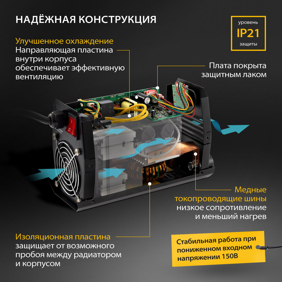 | Преимущества | Легкий поджиг дуги (Hot Start)_Форсаж дуги (ArcForce)_Антизалипание (Anti Stick)_Дополнительная система защиты силовых транзисторов (IGBT)_Работа от пониженного входного напряжения 150 В | |