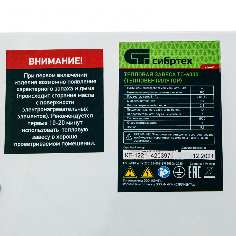 Электрическая тепловая завеса (тепловентилятор) Сибртех ТС-6000 96442 создает узконаправленный воздушный поток, позволяющий разделить различные климатические зоны, например, отделить воздух в помещении от воздуха снаружи. Зимой она поможет справиться со сквозняками и защитит помещение от холодного воздуха, а летом сохранит прохладу в кондиционируемом помещении.    Воздушно-тепловая завеса устанавливается над оконными или дверными проемами и обеспечивает производительность 780 м3/ч. Питается от сети 220 В, поэтому подходит для домашнего применения. Выдержанная в нейтральном стиле, она отлично смотрится в любом интерьере.    Преимущества    3 режима работы — обдув без нагрева, 3 кВт и 6 кВт — позволяют использовать завесу для различных целей.    Тепловентилятор не только поддерживает комфортную температуру в помещении, но и предотвращает проникновение дыма, пыли и мелких насекомых.    Длина 1,1м позволит создать воздушную завесу по всей ширине дверного проема.    Встроенная термозащита предохраняет оборудование от поломок по причине перегрева.    Игольчатый нагревательный элемент обеспечивает быстрый разогрев до заданной температуры.    Пульт дистанционного управления позволит комфортно и точно выставить желаемую температуру.